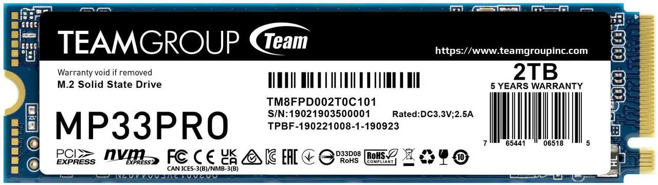 Disco Duro Solido SSD Team Group MP33 PRO 2TB PCIe M.2 2280 hasta 3500 MB/s