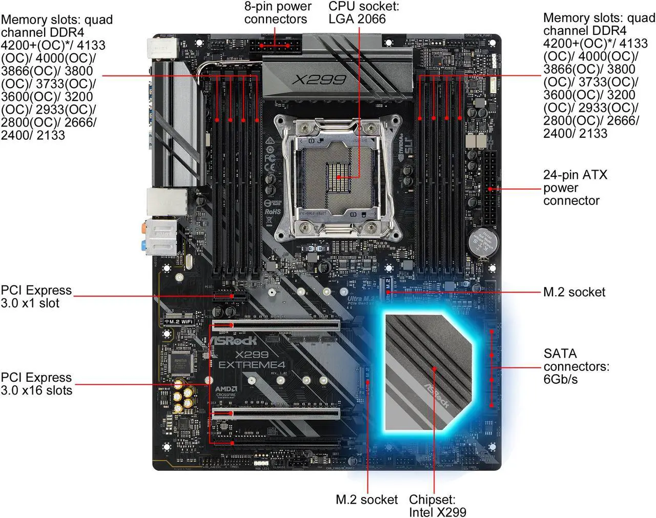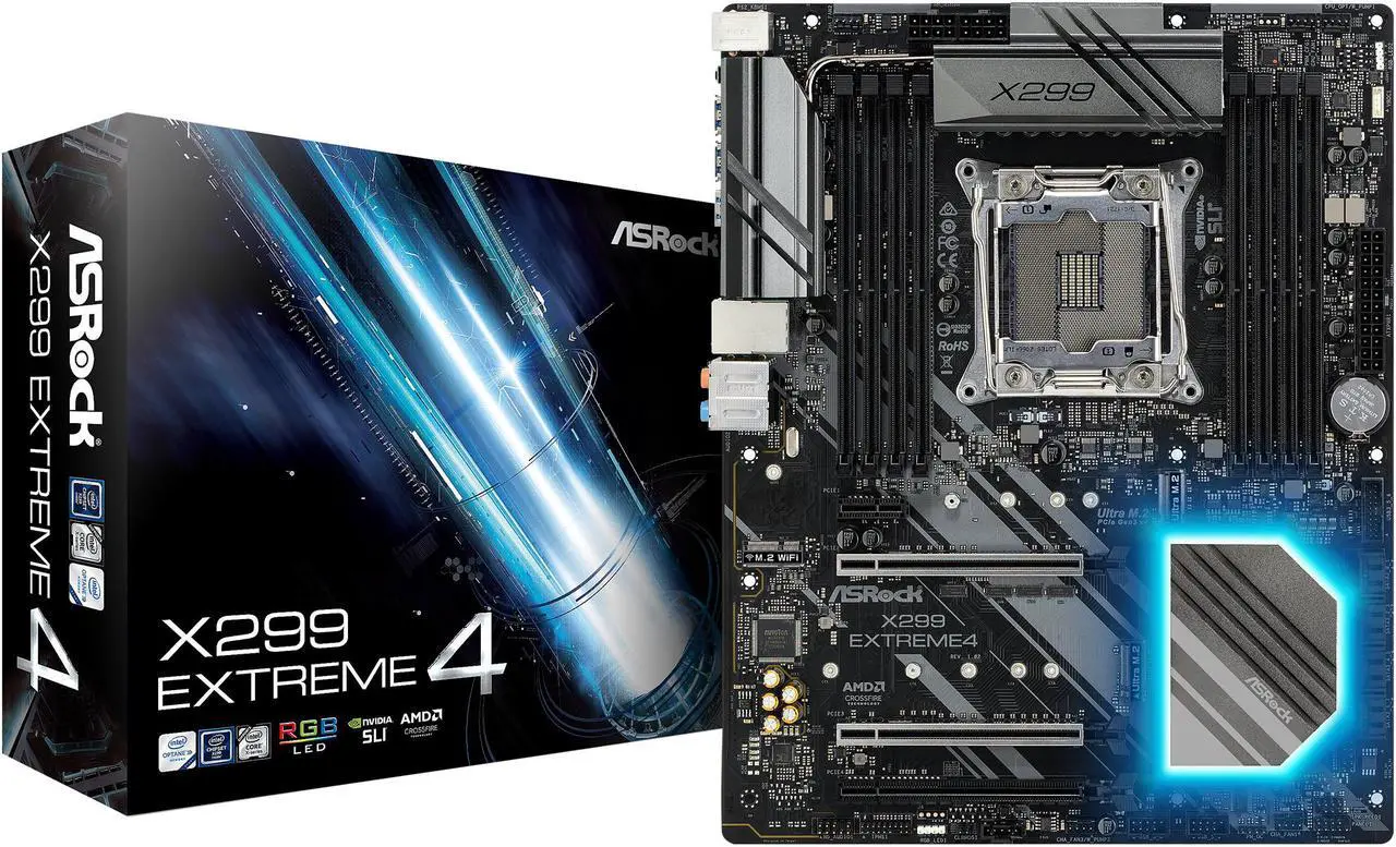 La ASRock X299 Extreme4 combina el chipset Intel X299 con el socket LGA 2066 para la familia Intel Core X‑Series. Su VRM digital de 11 fases con disipadores y heatpipe asegura entrega de energía estable para flujos de trabajo HEDT y OC. El formato ATX brinda expansión total con tres ranuras PCIe 3.0 x16 de acero, ideales para GPUs potentes; además, el backpanel incluye USB 3.1 Gen2 Type‑A/C y botón Clear CMOS para ajustes rápidos.