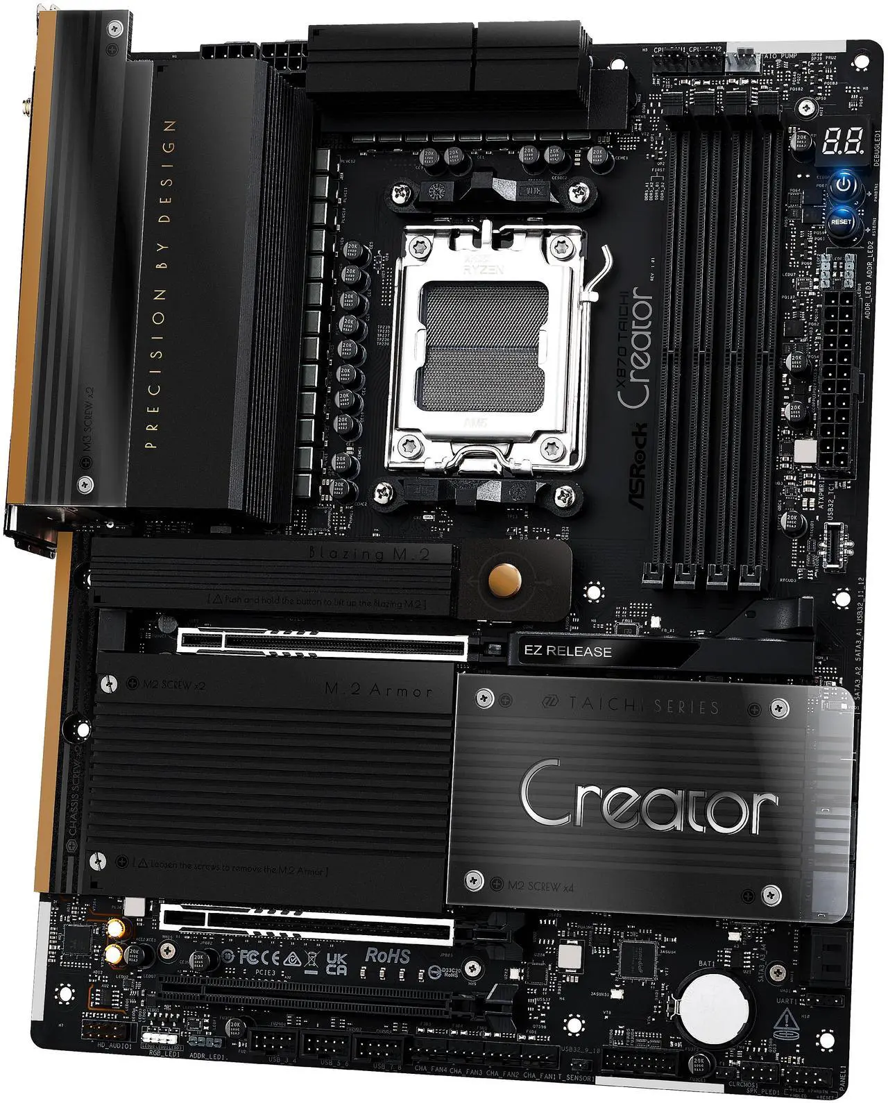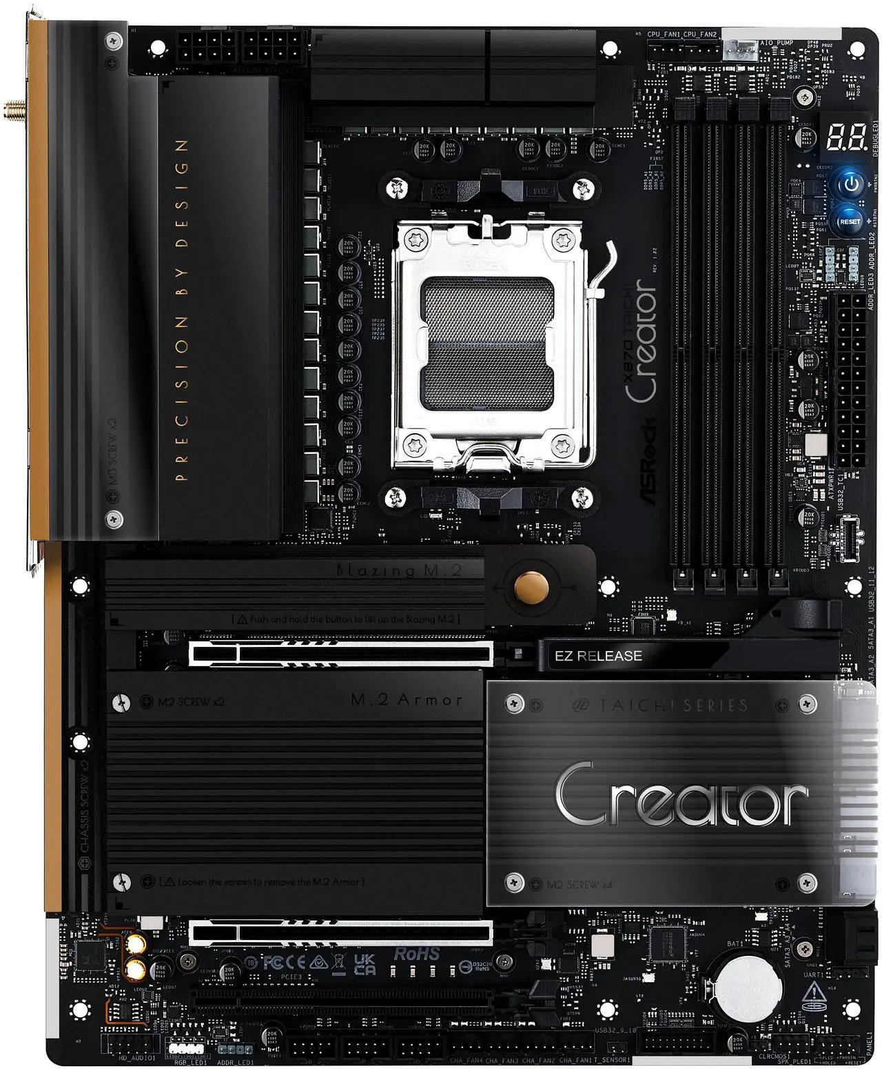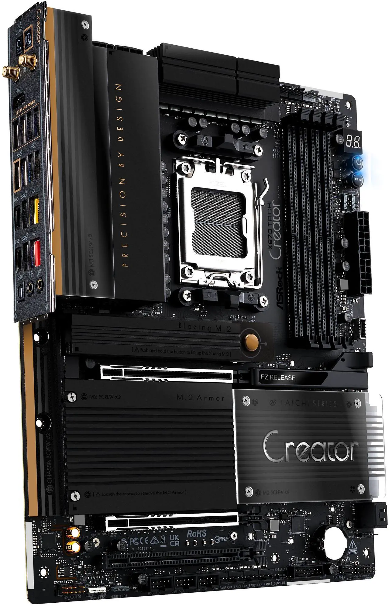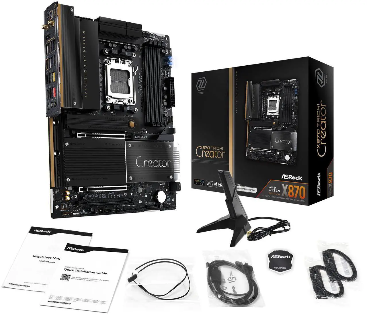 La **ASRock X870 Taichi Creator** es una **ATX** con **socket AM5** y **chipset AMD X870** orientada a creadores y flujos de trabajo exigentes con **Ryzen 7000/8000/9000**. Su VRM de alto amperaje con chokes premium y disipadores masivos mantiene estabilidad bajo render y compilación prolongados.