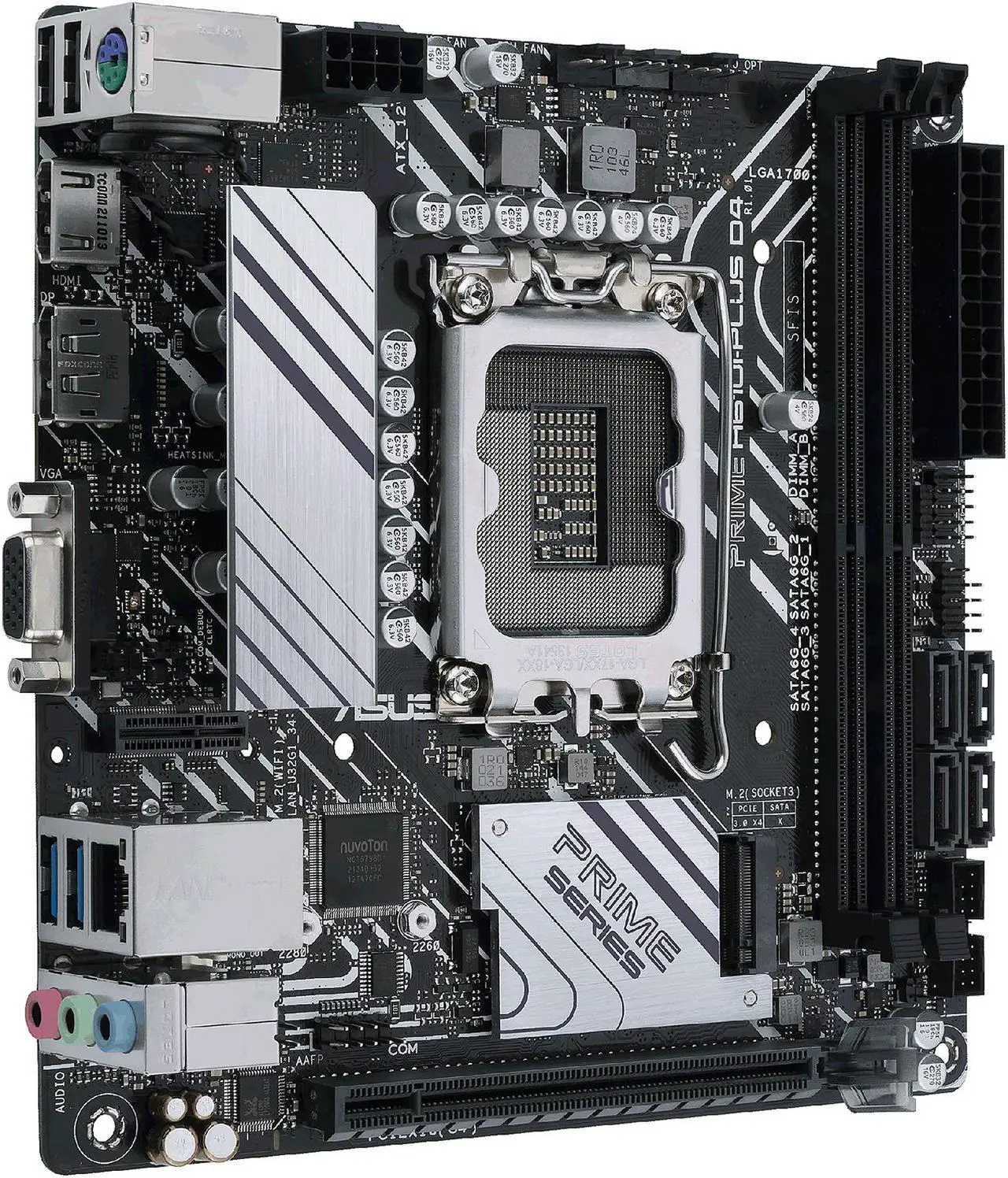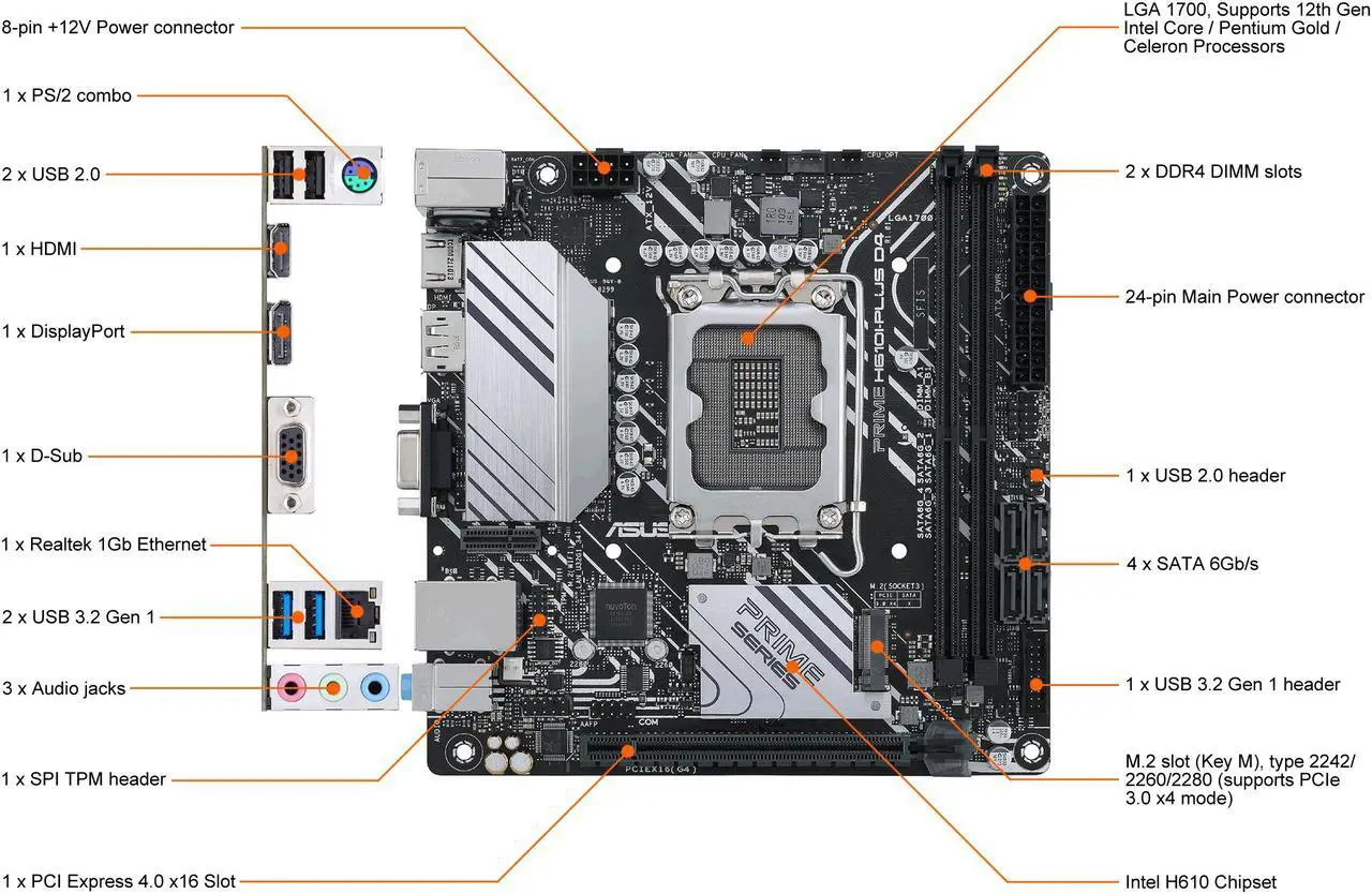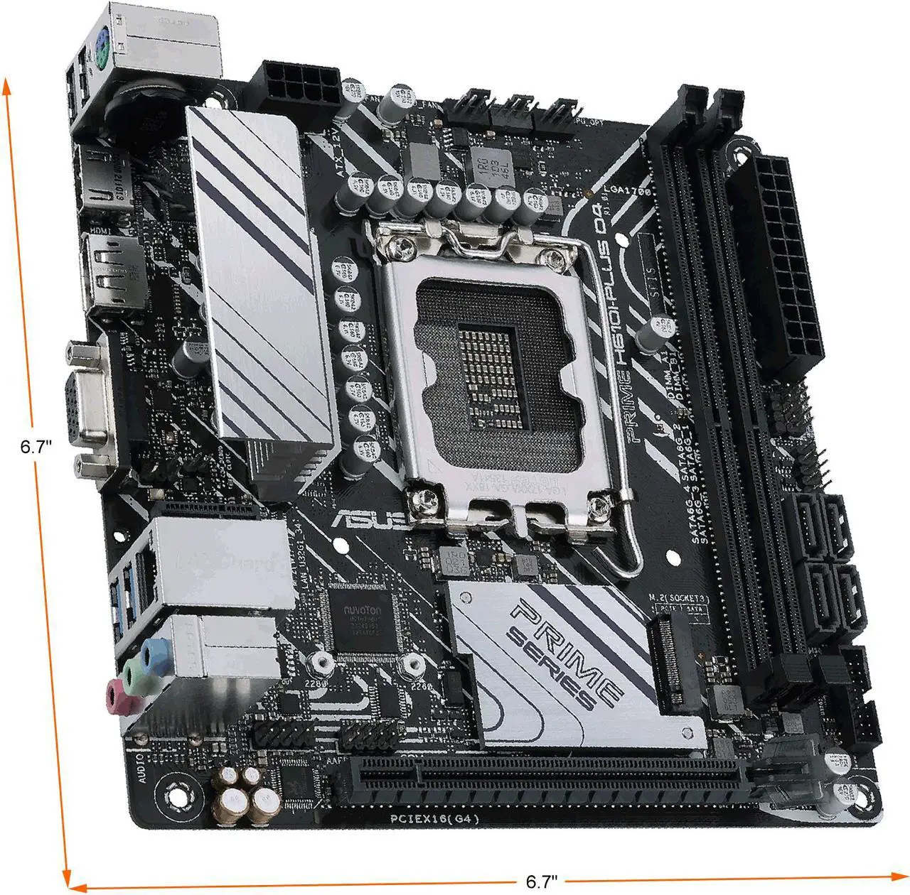 La ASUS PRIME H610I‑PLUS D4‑CSM se basa en el chipset Intel H610 y socket LGA 1700, compatible con Intel Core 12ᵃ/13ᵃ/14ᵃ generación y plataformas con Intel vPro. La ranura principal PCIe 4.0 x16 permite aprovechar GPUs actuales, mientras su VRM eficiente con disipación en zonas críticas brinda estabilidad en chasis SFF. El enfoque PRIME prioriza confiabilidad y facilidad de administración para uso profesional y doméstico.