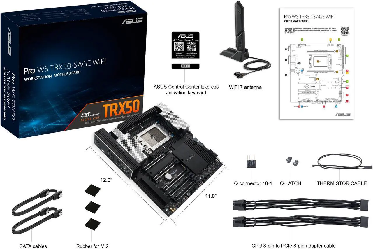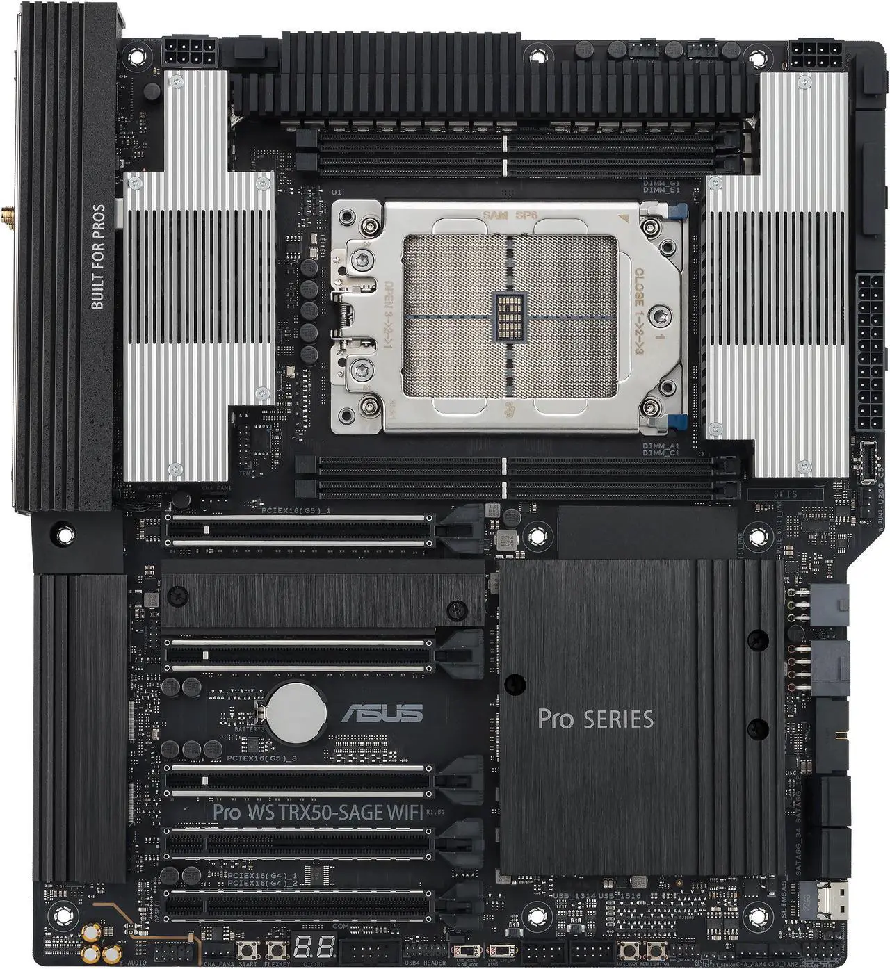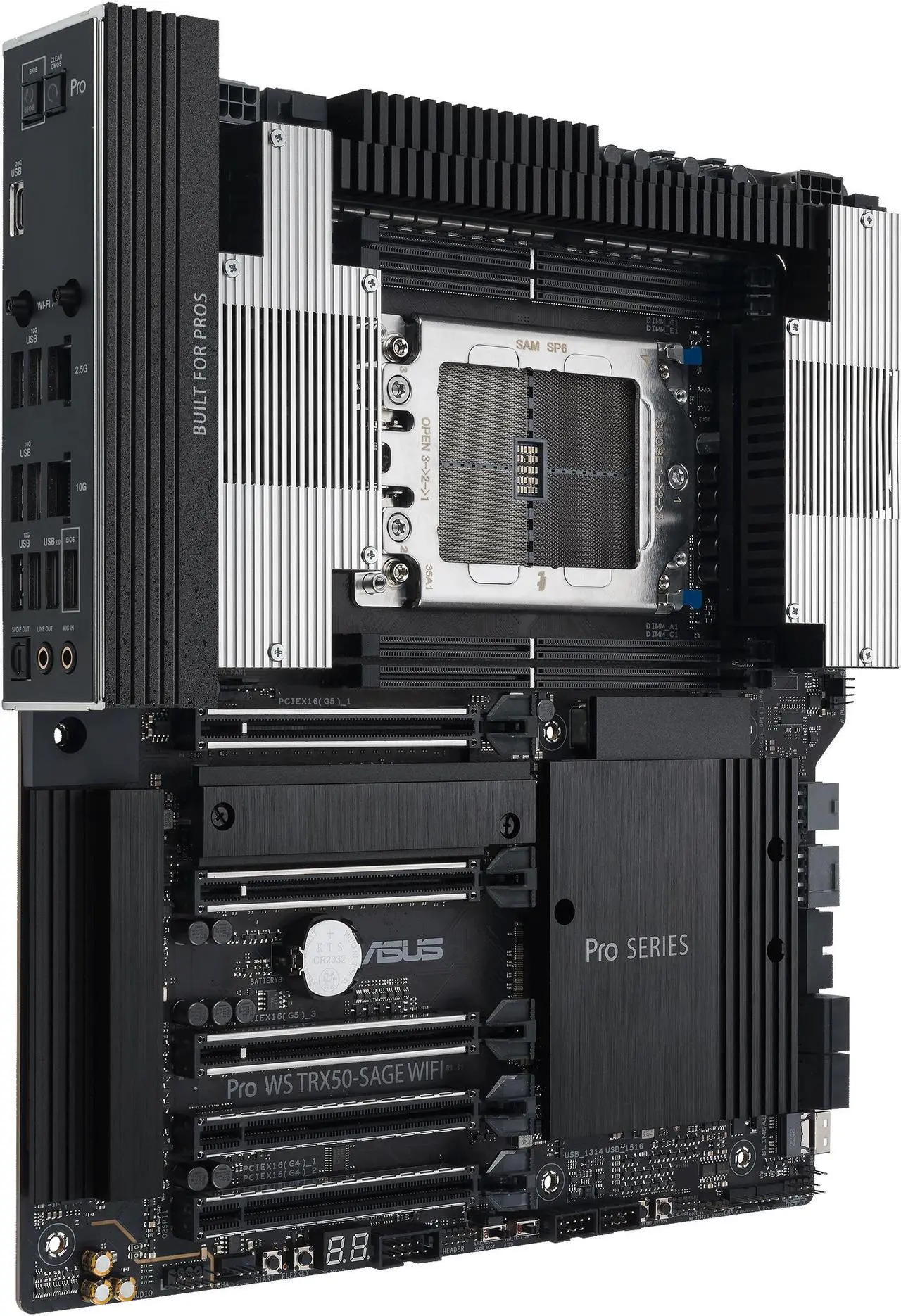 Pro WS TRX50‑SAGE WIFI con sTR5 + TRX50 para Threadripper 7000/PRO 7000 WX‑Series; VRM 36 etapas y DDR5 RDIMM ECC quad‑channel.