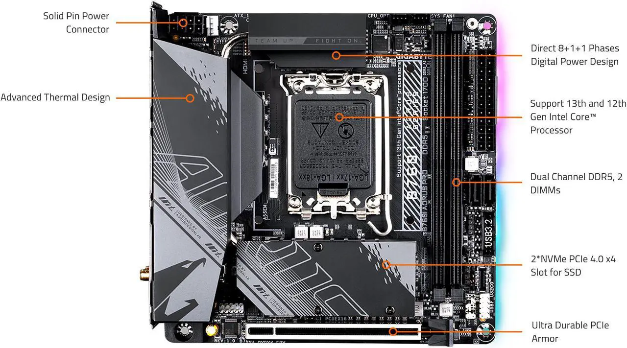 Compatible con Intel 12th/13th/14th Gen Core (LGA1700), esta placa con chipset Intel B760 y socket LGA1700 es ideal para builds SFF potentes. Su VRM digital de múltiples fases con DrMOS ofrece estabilidad y eficiencia térmica, mientras el formato Mini ITX facilita un armado limpio sin renunciar a prestaciones AORUS de gama entusiasta.