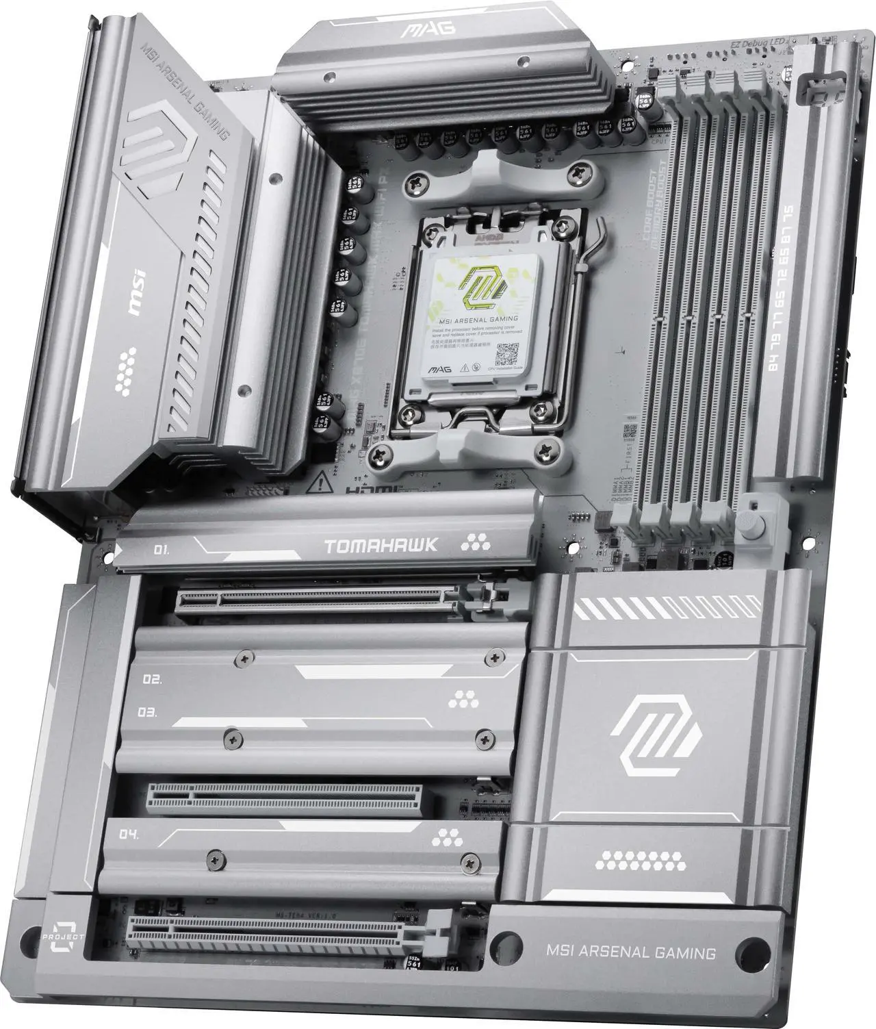 Incluye 4 ranuras DDR5 dual channel hasta 256 GB y almacenamiento ultrarrápido mediante tres M.2 PCIe 5.0 y un M.2 PCIe 4.0, además de 4 puertos SATA 6 Gb/s. Su slot PCIe 5.0 x16 reforzado permite instalar GPUs de última generación, mientras que la conectividad moderna se completa con USB 3.2 Gen2x2 Type-C, DisplayPort y HDMI 2.1 para salidas 4K. Los disipadores M.2 Shield Frozr mantienen temperaturas óptimas para SSDs NVMe.