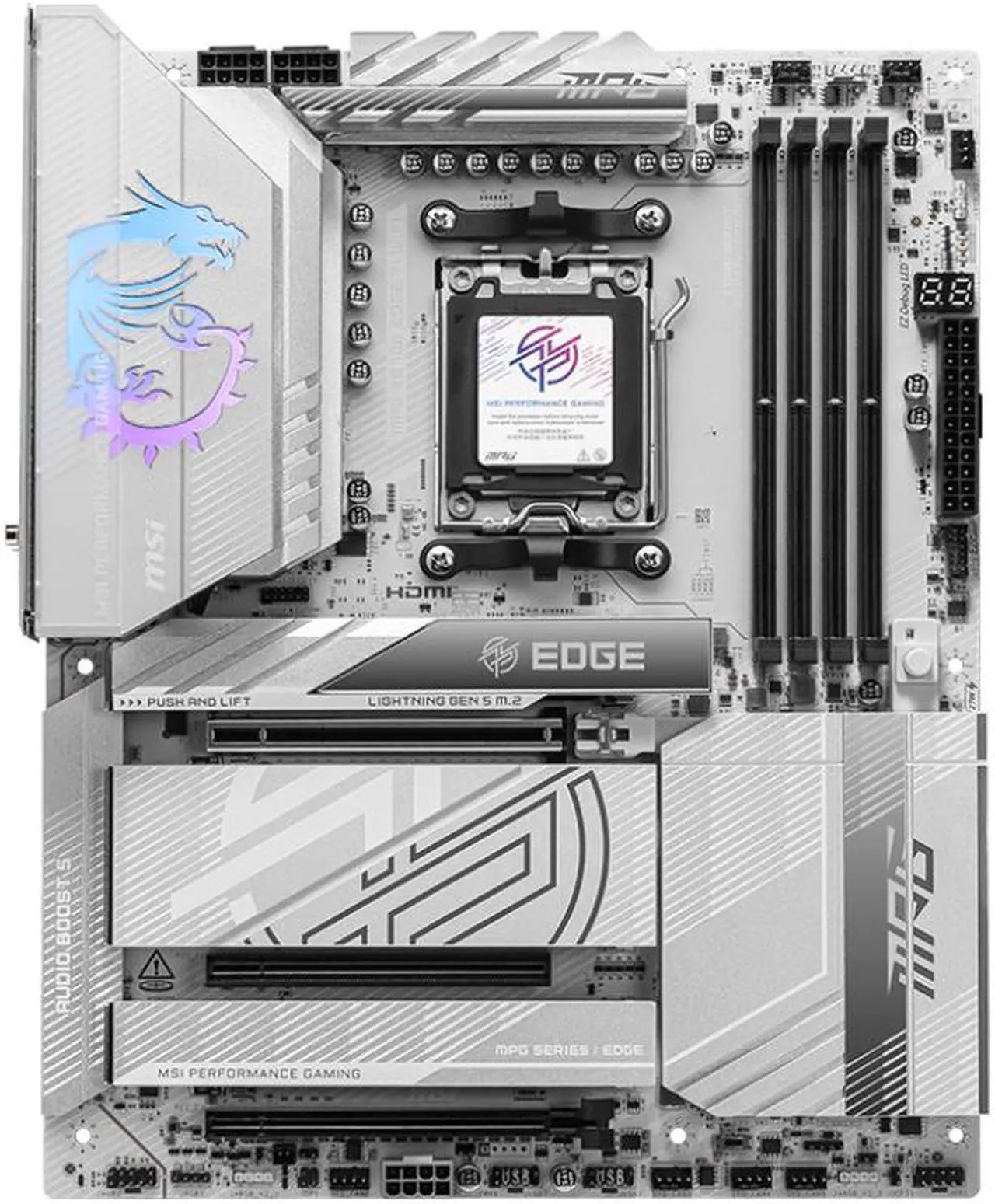 La **MSI MPG X870E EDGE TI WiFi** combina **socket AM5** y **chipset AMD X870E** en formato **ATX**, lista para **Ryzen 7000/8000/9000**. Su VRM digital de alto amperaje con disipadores Frozr garantiza suministro estable y temperaturas controladas durante sesiones intensas de juego o creación.
